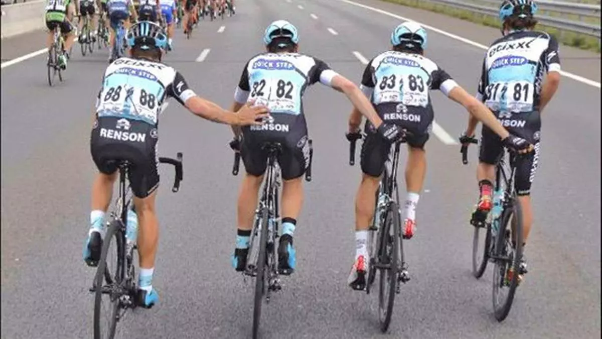 Urán muestra así un recurso habitual en el mundo del ciclismo, en el que los corredores muchas veces no tienen tiempo suficiente para parar ni siquiera para hacer sus necesidades. La imagen no deja de ser curiosa: mientras el colombiano orina encima de la bicicleta, tres compañeros del equipo Etixx - Quick Step forman una cadena para no desestabilizarse y mantener el ritmo en la carrera.