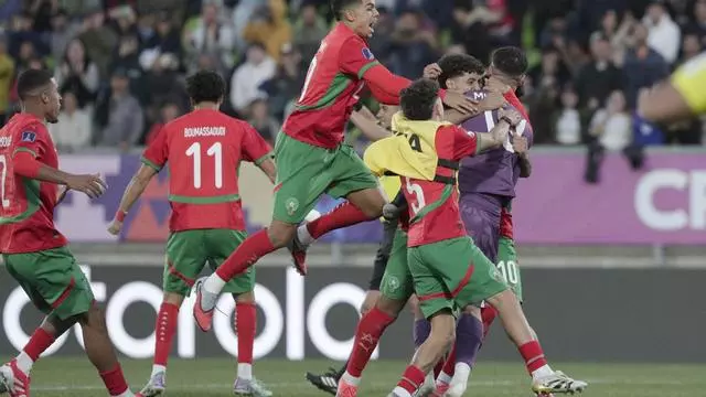 Jugadores de Marruecos celebran el paso a la final del Mundial Sub-20 de Chile con Abdelhakim El Mesbahi, su tercer portero y el héroe que atajó el penalti decisivo con el que eliminaron a Francia en el estadio Elias Figueroa Brander de Valparaíso / Adriana Thomasa / EFE