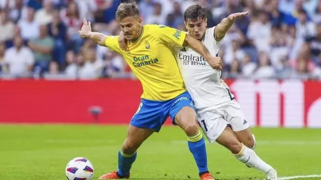 Eric Curbelo pelea un balón junto a Brahim, en la disputa entre el Real Madrid y la UD Las Palmas en 2023, en el Santiago Bernabéu. / LP/DLP